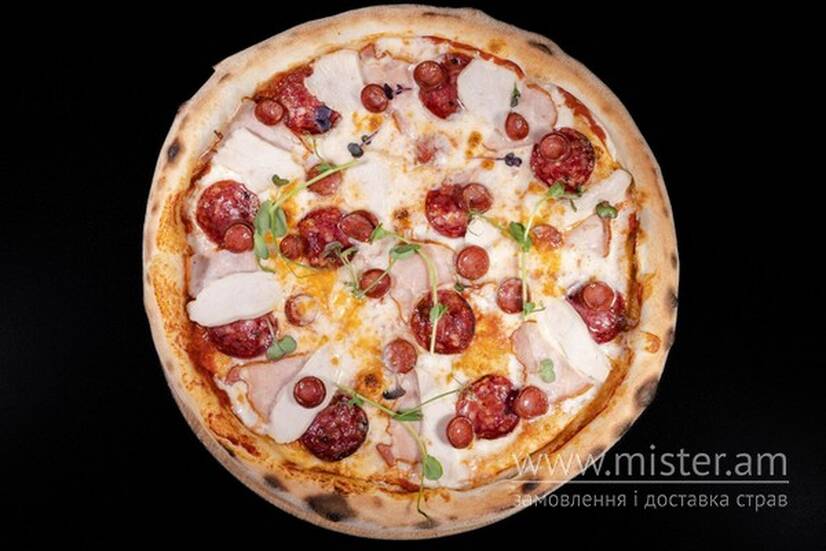 Піца основа, томатний соус, сир Моцарела, курка гриль, орегано, салямі, мисливські ковбаски, шинка.