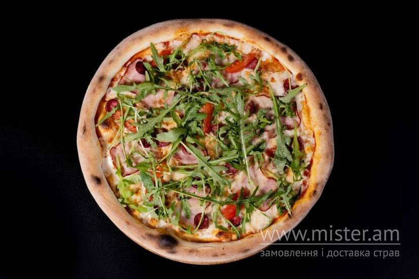 Піца на червоному соусі з ніжною та соковитою грудинкою, мисливськими ковбасками, чері, руколою, часником, моцарелою. Декоруємо мікрозеленню.
