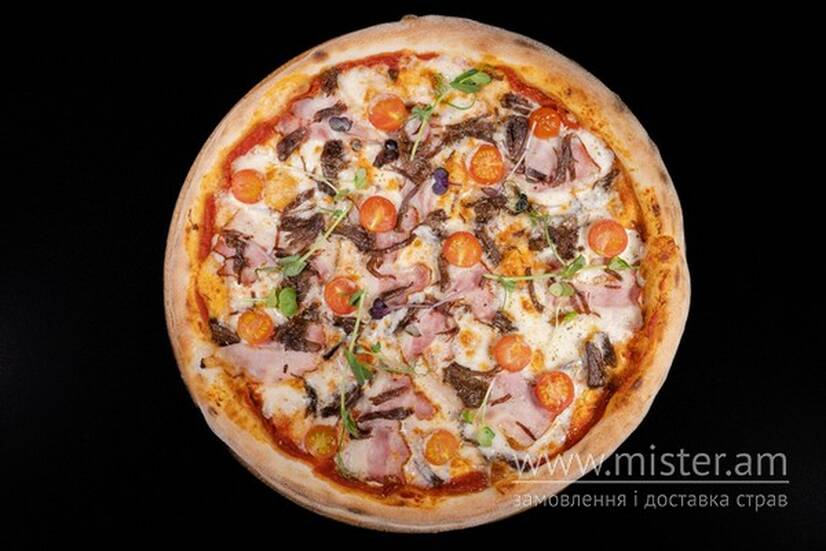 Піца основа, томатний соус, сир Моцарела, рване м'ясо, грудинка, помідори Чері, орегано.