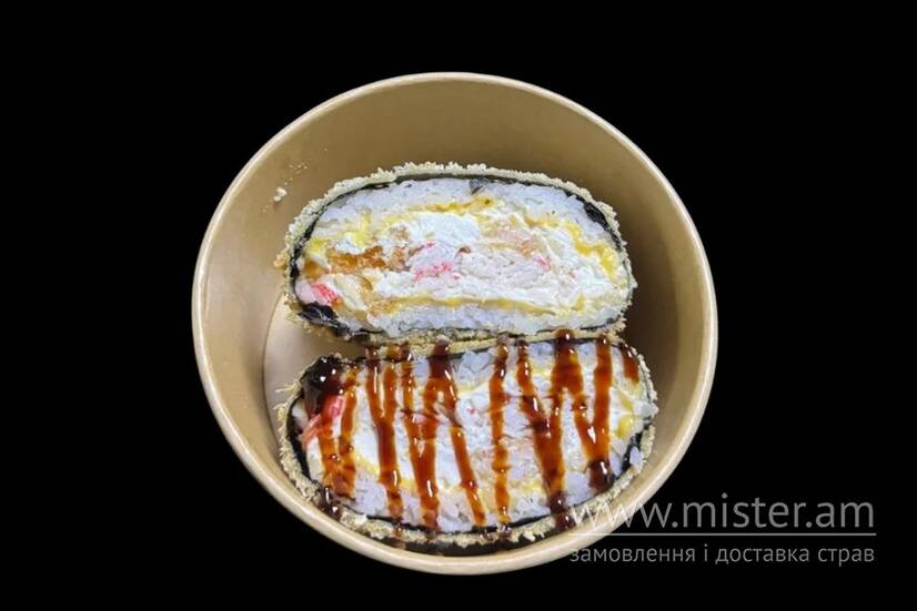 Преміальний рис,креветки панко,сніжний краб, сир філадельфія, сир тостовий, поливається соусом унагі. Подаємо з додатковим соусом унагі.
