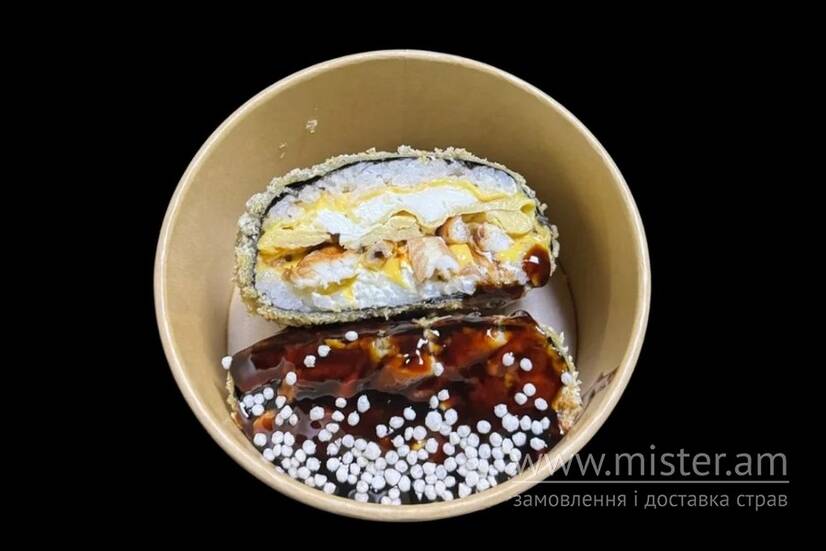 Преміальний рис, вугор, томаго, сир філадельфія, сир тостовий, поливається соусом унагі. Подаємо з додатковим соусом унагі.
