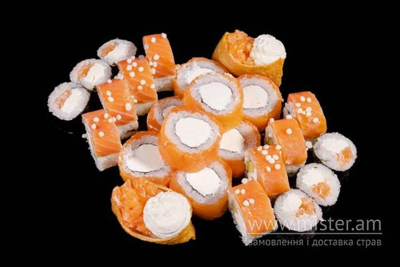 Філадельфія з копченим лососем, Філадельфія класік з лососем, Інарі з лососем, макі з лососем та сиром.