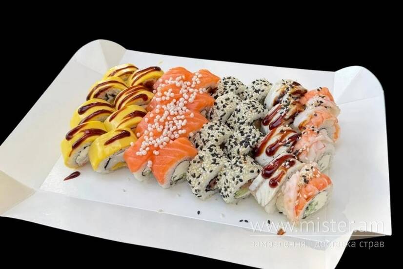 Філадельфія з лососем, Каліфорнія з лососем в кунжуті, Чіз рол з крабом та сніжним крабом, Філадельфія з тигровою креветкою (пів рола), Філадельфія з вугрем (пів рола).