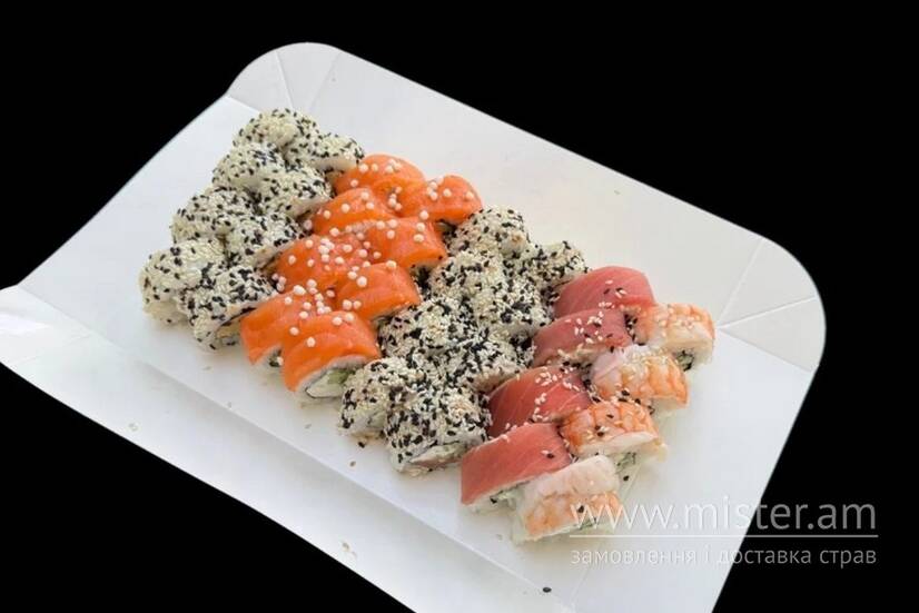 Філадельфія з лососем, Філадельфія з креветкою (пів рола), Філадельфія з тунцем (пів рола), Каліфорнія з лососем в кунжуті, Каліфорнія з вугрем та томаго.
