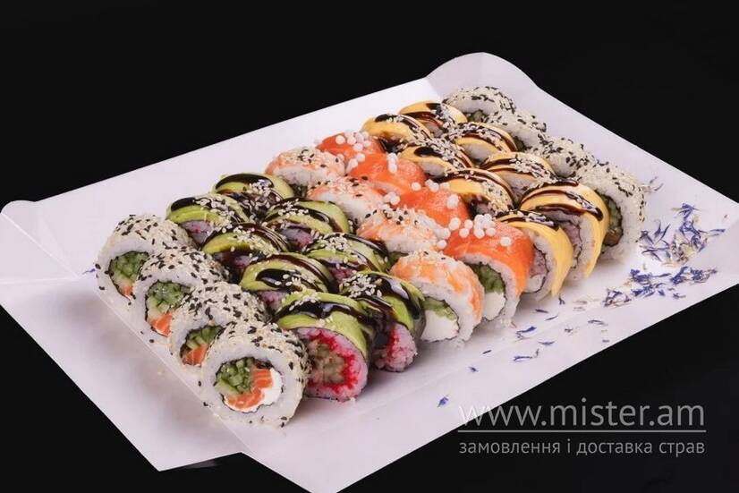 Філадельфія з креветкою (піврола), Філадельфія з лососем (піврола), Чіз рол з крабом, рол Мінамі Дані в авокадо, Каліфорнія з лососем та горіховим соусом.
