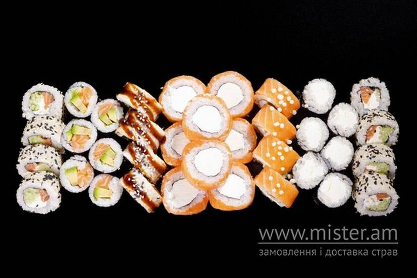 Рол Унагі Салмон, Каліфорнія з лососем в кунжуті, макі філа, макі з лососем та авокадо, Філадельфія класік з лососем, Філадельфія класік з копченим лососем.