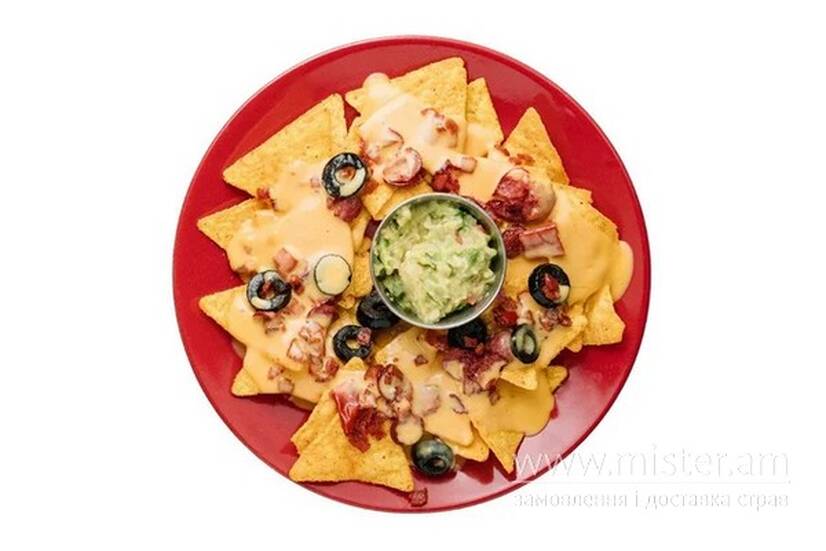 З сиром чеддер, ковбасами, маслинами та соусом гуакамоле.