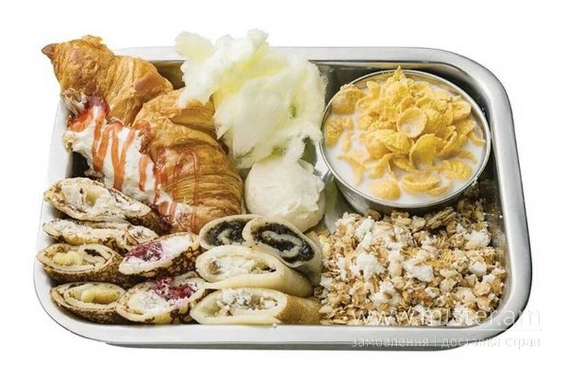 Хрумкий круасан з вершками та топінгом, глазуровані пластівці з молоком, гранола з творожною масою та родзинками, кулька морозива, солодка вата та 5 млинчиків з різною начинкою: з творогом, з маком, з карамелізованими яблуками, з домашніми вишнями та вершками, з бананом та вершками.