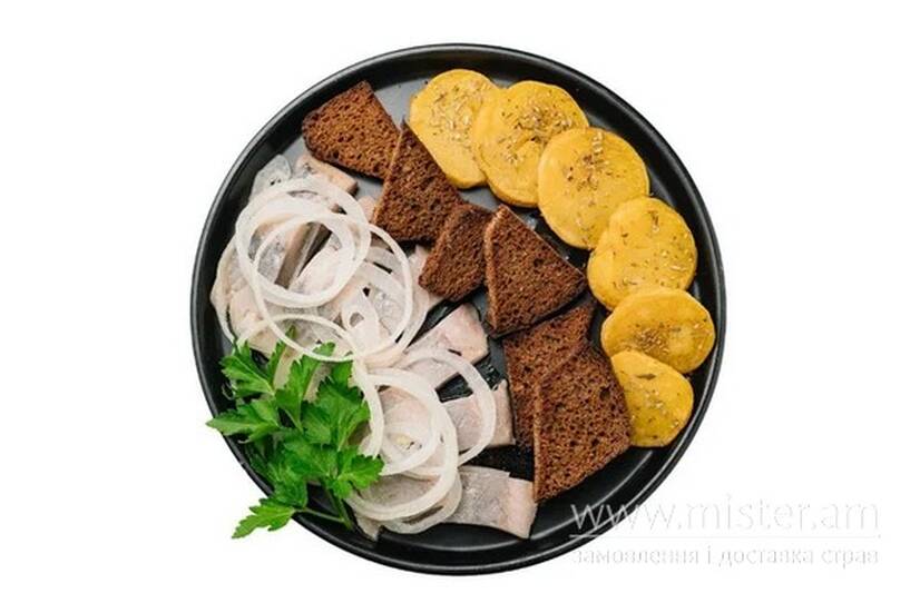 Картопля печена, грінка з бородинського хліба, оселедец.