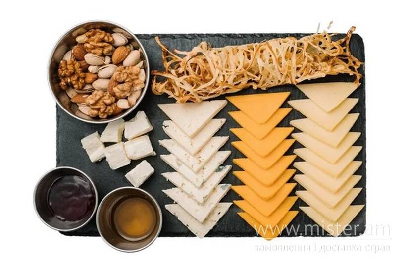Сир блакитний, чеддер, фета, гауда, грецькі горіхи, мед, чечель сушений, мікс горіхів, топінг журавлиновий.