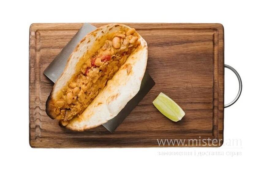 Свинина смажена в апельсиновому соці, східні трави, квасоля в томаті, перець болгарський, чілі маринований, лайм, перець каєнський, томатний гострий соус.