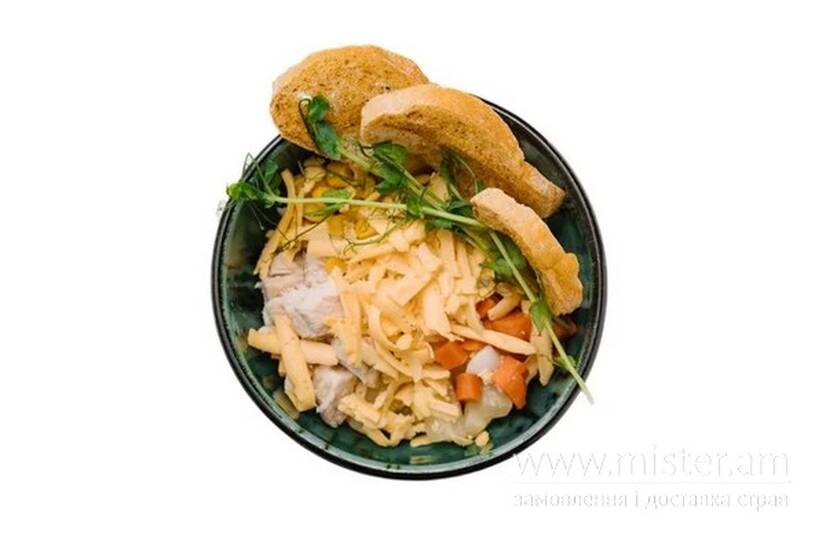 Куряче філе варене, сир твердий, ананаси, цукрова кукурудза,яйце, майонез, морква, крутони з білого багету.