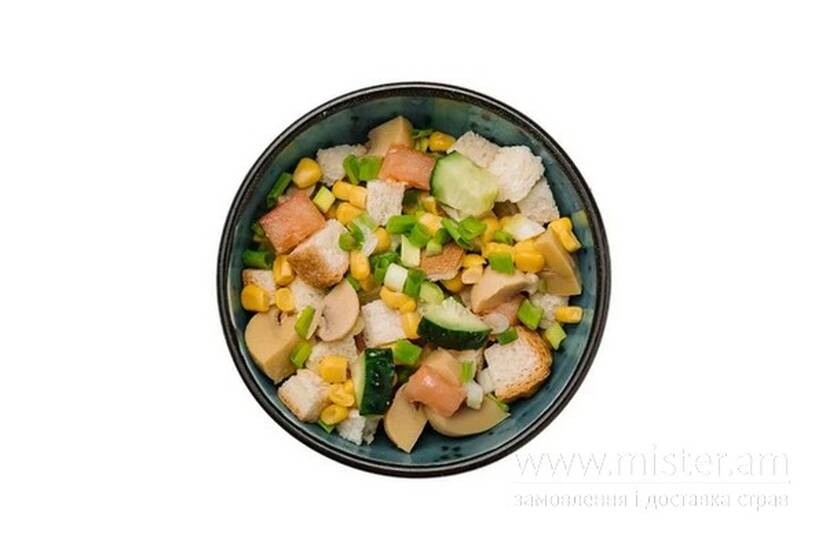 Грінки з багету, помідор, огірок, печериці мариновані, цибуля зелена, кукурудза цукрова, майонез.