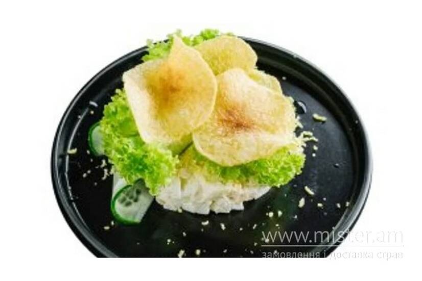 Крабове м`ясо, слайси огірка, твердий сир, яблука, яйце, мікс салату, чіпси, кукурудза цукрова.