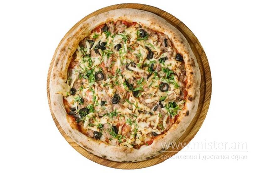 Cоус з тертих томатів, моцарела, яловичина у томатному соусі, кінза, копчений сир, маслини.