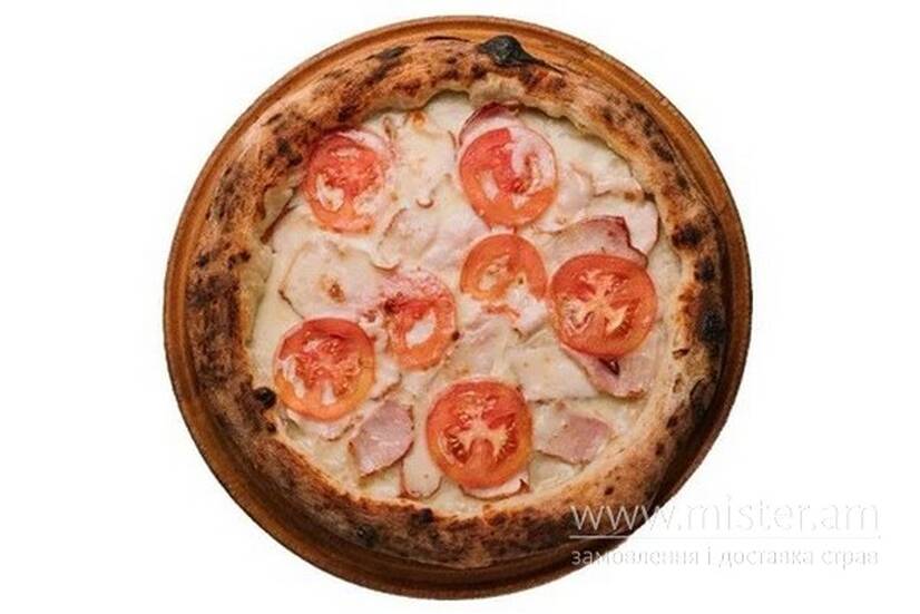 Копчений бочок, копчене куряче філе,помідор, моцарела, вершковий соус.
