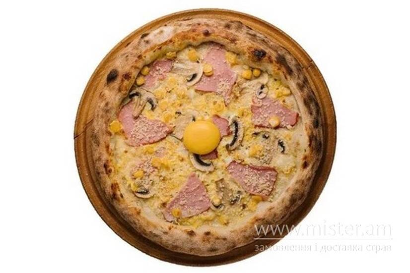 Соус вершковий, куряче яйце, кукурудза цукрова, шинка, печериці, пармезан, сир гауда, моцарела.