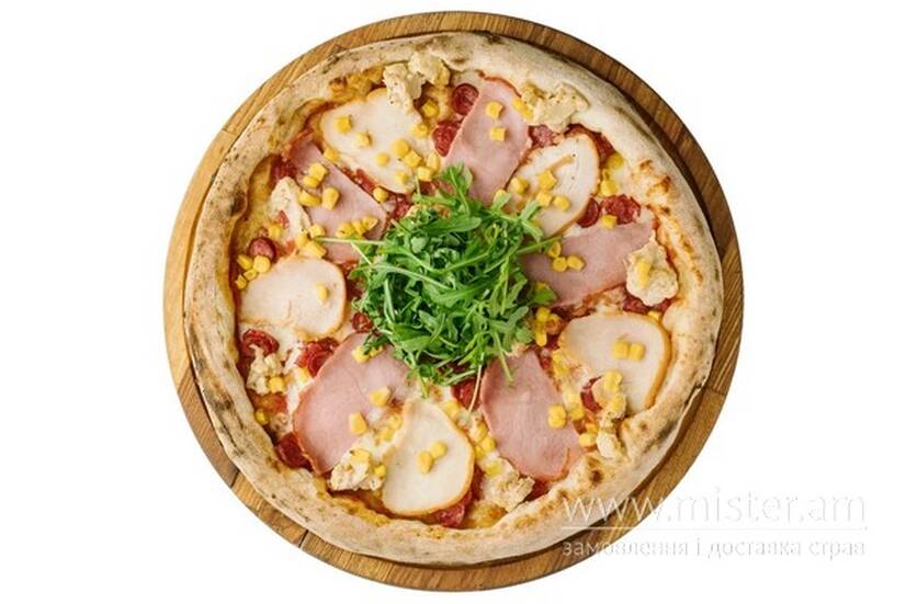 Соус з тертих томатів, моцарела, кукурудза, руккола, копчена курка, мариноване куряче філе, мисливські ковбаски, шинка.