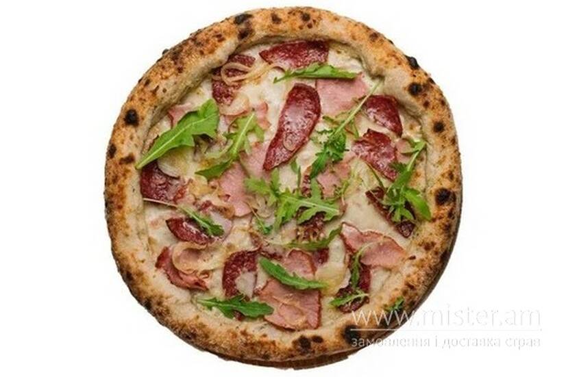 Бортик з молочних сосисок, вершковий соус, сир блакитний, моцарела, українська салямі, шинка, орегано сушений, рукола, цибуля карамелізована.