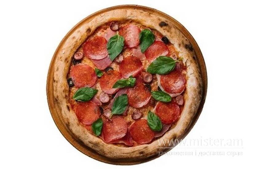 Ковбаски баварські, прошуто, пепероні українська сирокопчена, моцарела, базилік свіжий, соус із тертих томатів, маслини, орегано сушений.