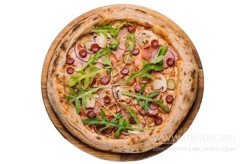 Мисливські ковбаски, шинка, моцарела, цибуля червона, печериці , домашній маринований огірок, рукола, соус із тертих томатів.