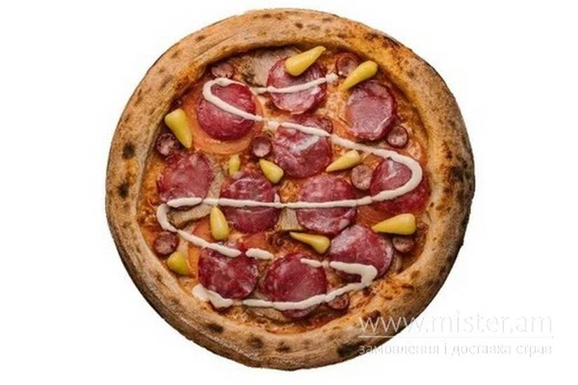 Соус із тертих томатів, соус децердо, буженина домашня, баварські ковбаски, "Газдовська" сирокопчена салямі, помідор, турецький перець.