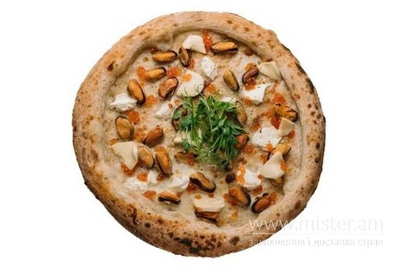 Сир каліфорнія, соус вершковий, моцарела, ікра горбуші, мідії чилійські, моцарела маринована, орегано сушений, мікрозелень.