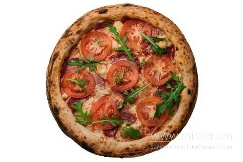 Салямі українська, помідор, мариноване куряче філе, моцарела, соус із тертих томатів, рукола.