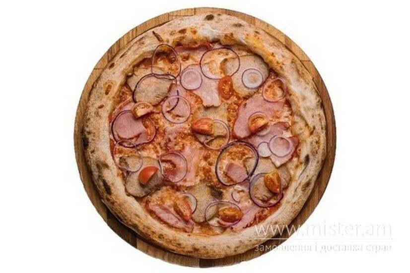 Шинка, бочок копчений, буженина, помідор чері, цибуля червона,моцарела, соус із тертих помідор.