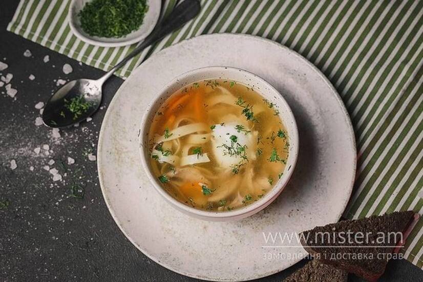 Бульйон з білих грибів, подається з домашньою локшиною, підсмаженими білими грибами з цибулею, та зеленню.