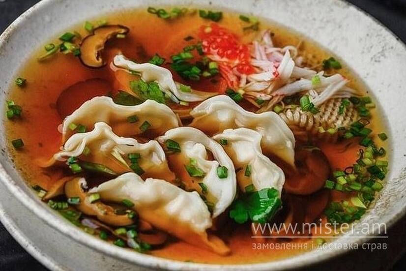 Ніжні китайські пельмені з копченим лососем, дайконом, шиїтаке та зеленою цибулею.