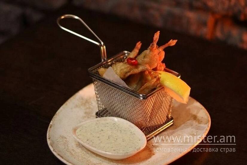 Чищений анчоус маринований в коріандрі соєвому соусі з лимоном в хрусткому пивному клярі, подається з лимоном, та чилі, подається з соусом тар-тар.