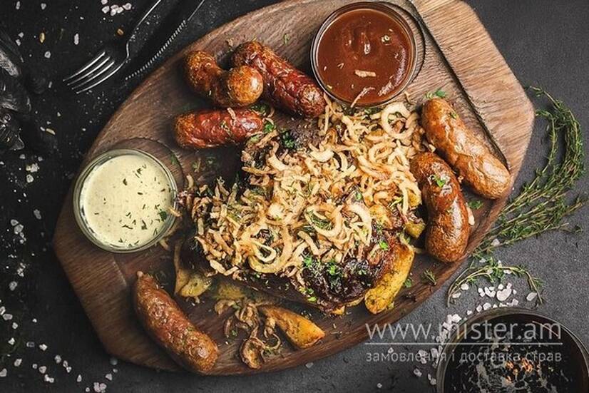 3 види ковбасок, картопля по селянськи, тушкована капуста, соус хрінний, соус BBQ, посипається зеленню та цибулею фрі.