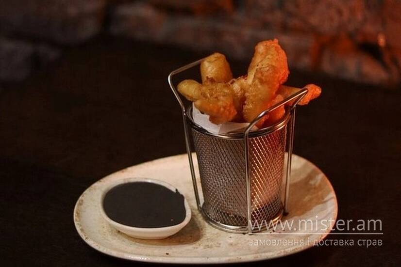 Хрусткі кульки з шампіньйонів із сиром сулугуні, сметанний соус і свіжа зелень.