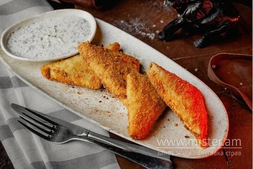 Хрусткий лаваш в паніровці, плавлений сирок, зелень, сметана, яйця курячі, подається з часниковим соусом, посипається чилі.