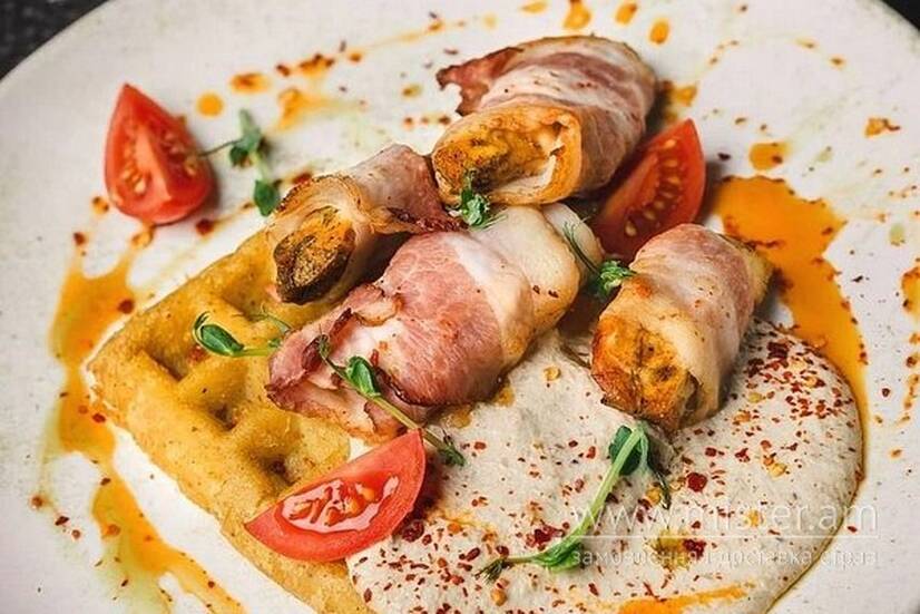 Запечене пряне куряче філе в хрусткому беконі подається з картопляною вафлею, соусом з лісових грибів, копченою олією, томатами чері та чилі.
