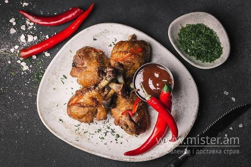 Мариновані в соєвому соусі та смажені у фритюрі, подаються з соусом BBQ, посипаються зеленню та чилі.