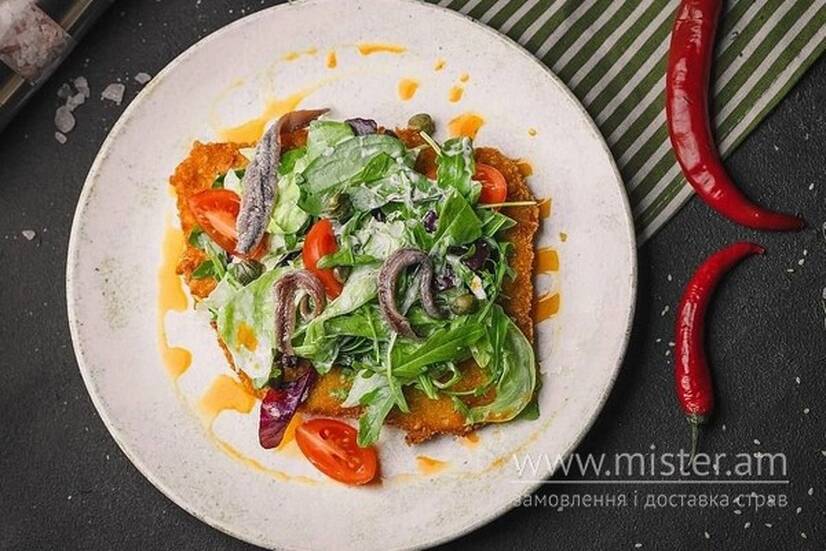 Соковитий та хрусткий курячий шніцель, під міксом салату з томати чері, анчоусами та каперсами, заправлений часниковим соусом, поливається олією з копченої паприки та посипається мікрозеленню.
