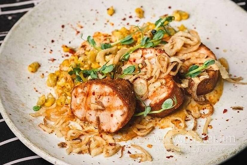 Філе індички, в пряних спеціях, подається з кукурудзою фрі.