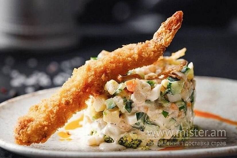 Три Слона Салат "Олів`є" з креветкою на зеленій подушці з пісочного тіста