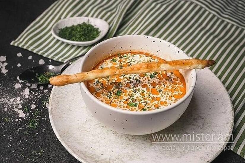 Вершковий рибний бульйон, копчений лосось, картопля, морква та зелень.