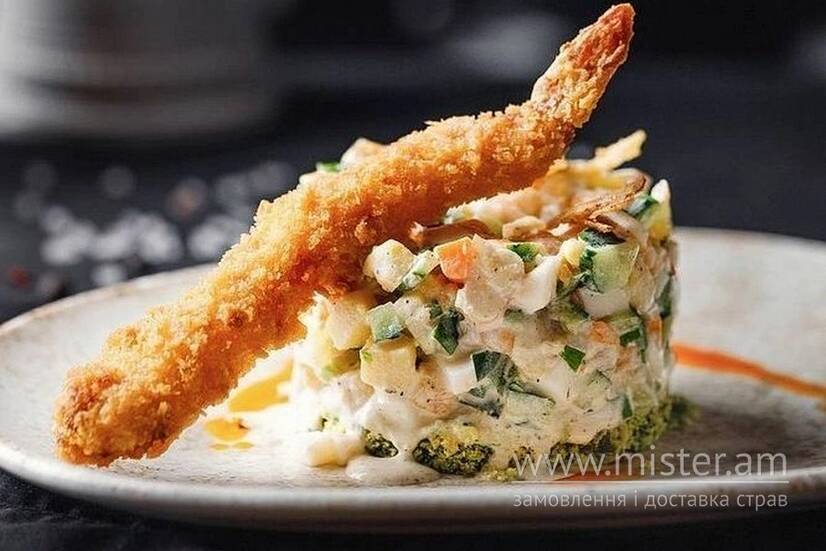 Смажені креветки, ніжний крем-сир, овочі та устричний соус.