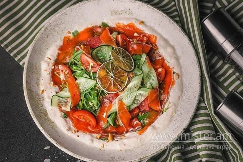 Смужки слабосоленого лосося, мікс салату, пікантний вершковий соус, філе грейпфрута, місо горішки, огірок, помідори чері, чіпс з лайму.