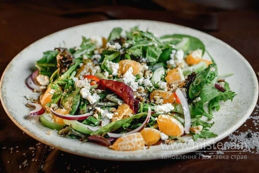 Мікс салату, мандарин, огірок сир бринза, синя цибуля, горіхи заправка на основі меду та оливкової олії.