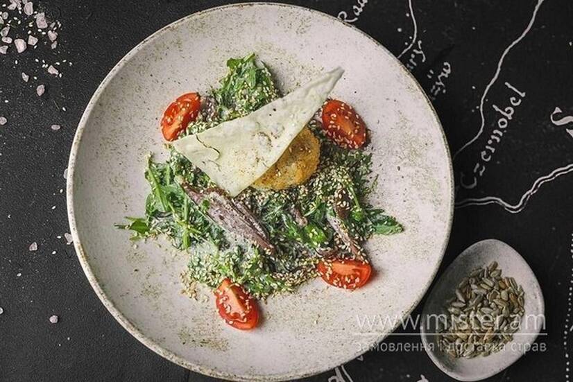 Яловичий язик, руккола, помідори чері, яйце пашот фрі, чіпс з пармезану, соус на основі домашнього майонезу, соєвого соусу та часнику, посипається смаженим кунжутом.