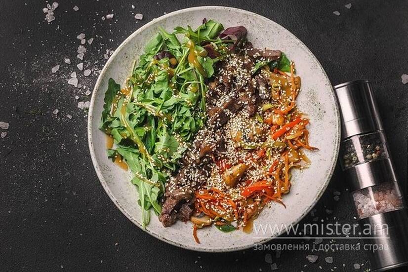 Тушковані телячі щічки, обсмажені печериці, цукіні, червоний перець, морква, подається з міксом салату, та медово-гірчичним соусом, посипається смаженим кунжутом.