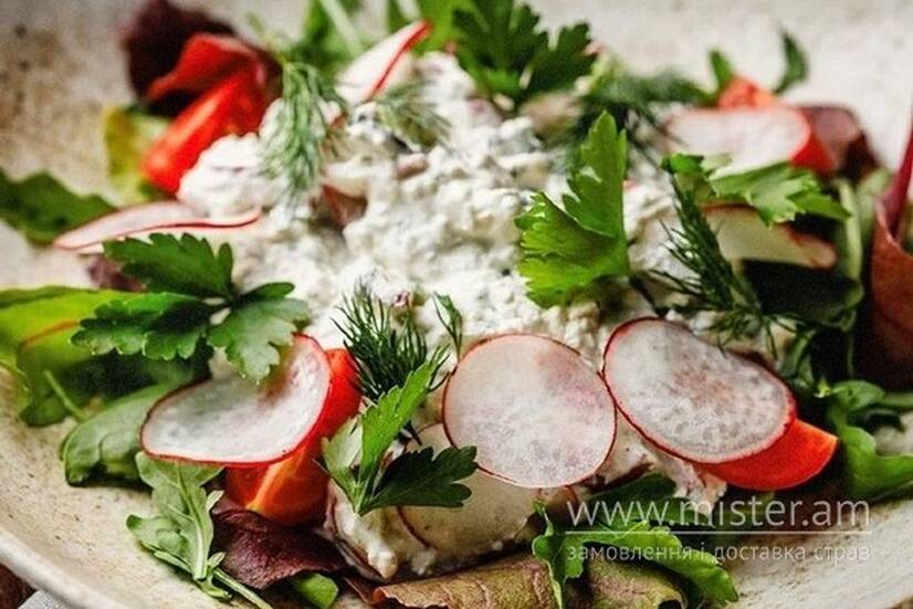 Мікс салату, огірок, помідор чері, творог, сметана, часник, зелень, редис.
