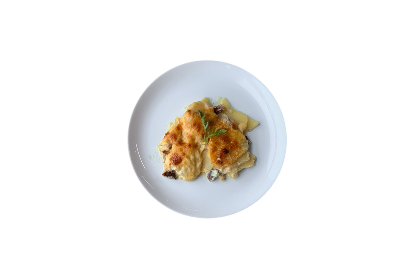 Картопля, вершки, твердий сир, пармезан, бочок копчений.