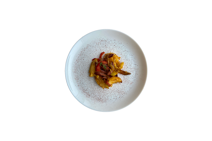 Картопля, мисливські ковбаски, цибуля, морква, томат.