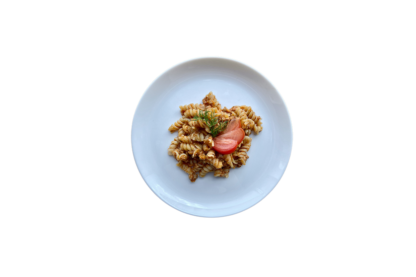 Макарони спіралька, масло, томатна паста, фарш свинний, цибуля, морква.